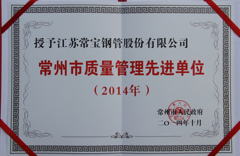 2014年常州市市長質(zhì)量獎和常州市質(zhì)量管理先進(jìn)單位名單11月13日公布。江蘇潤源控股集團(tuán)有限公司等6家單位獲得常州市市長質(zhì)量獎,江蘇常寶鋼管股份有限公司8家單位獲評常州市質(zhì)量管理先進(jìn)單位。(文/常寶股份 劉志峰)