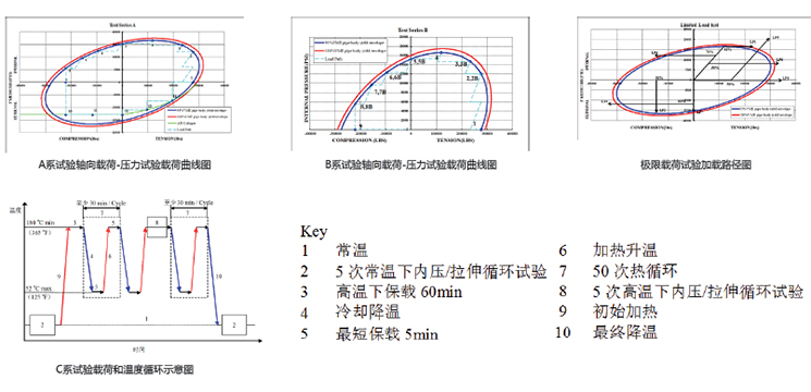 氣密封性能欄之A項為按API RP 5C5之3.3.4(最終內(nèi)壓循環(huán)與熱循環(huán)試驗,熱循環(huán)溫度177℃) 的試驗結(jié)果,B項為按TGRC1(彎曲、拉伸條件下氣密封試驗,彎曲狗腿度20°/30m,復合應力達到 管體屈服應力85%)的試驗結(jié)果。