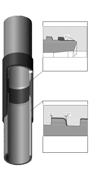 | 2)螺紋連接強度高——偏梯形螺紋(油管每英寸8牙,每英寸套管5牙) | |