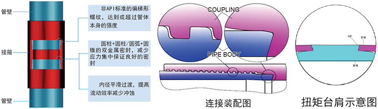 4)雙臺肩密封——雙臺肩設計抗過扭矩,保證密封性能。